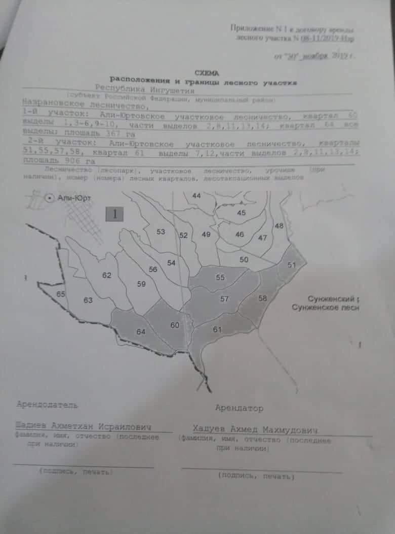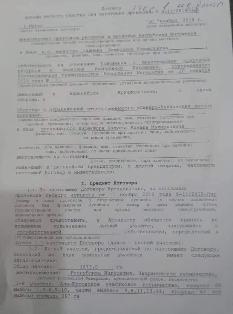 Действие настоящего договора начинается с момента официальной государственной регистрации. Он заключен с ООО «Северо-Кавказская лесная компания», директором которой числится Хадуев Ахмед Магомедович — уроженец Чеченской республики.