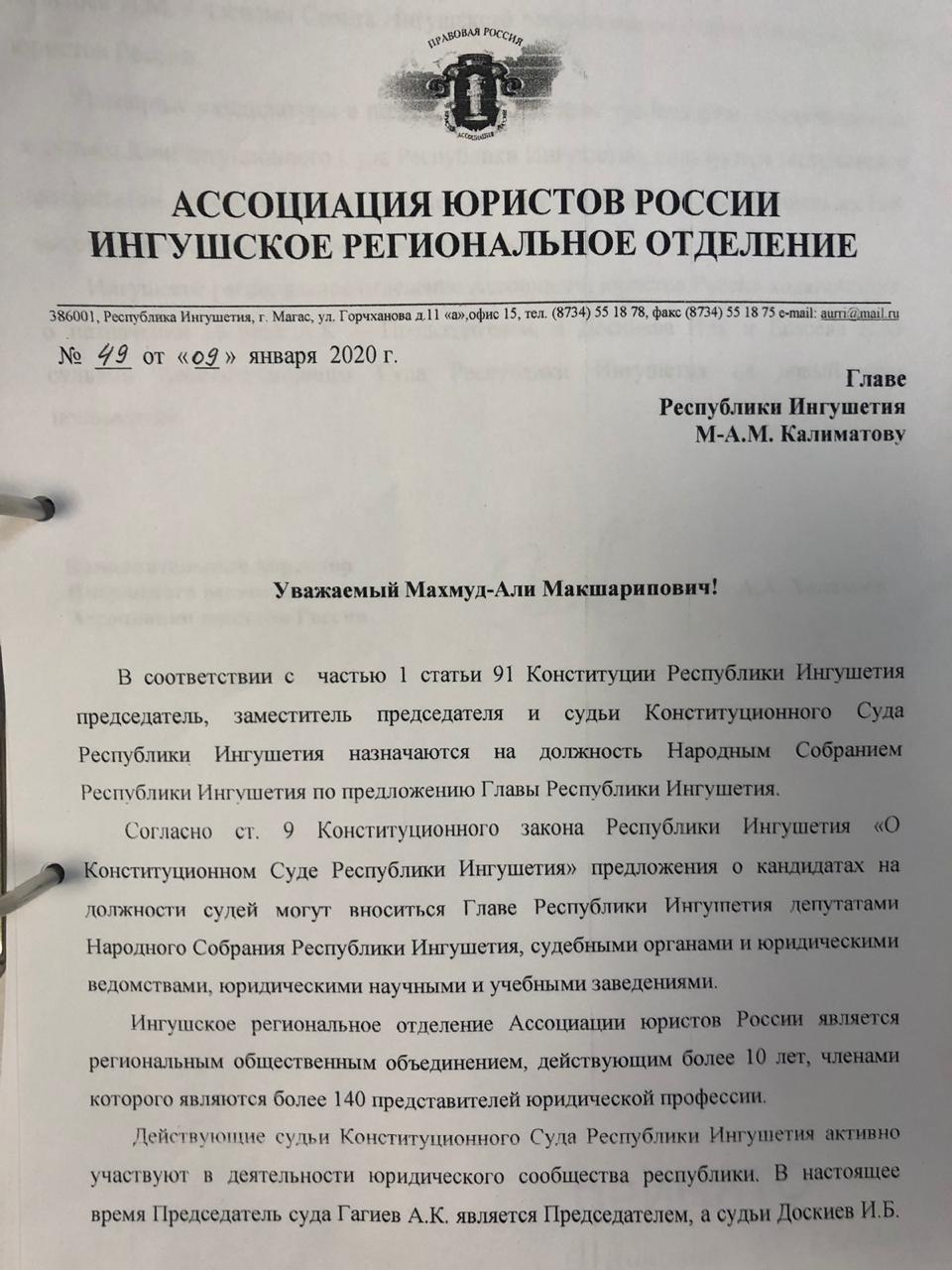Ходатайство об этом направлено на имя главы Ингушетии Махмуда-Али Калиматова в канцелярию 9 января 2020 года, за подписью исполнительного директора регионального отделения Ассоциации А.А. Халахоева.