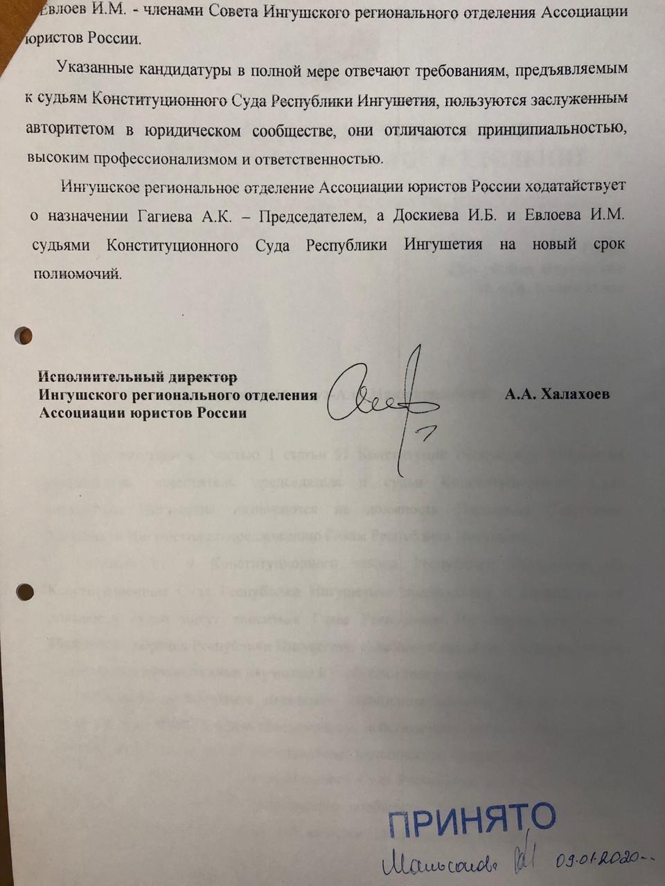 “Действующие судьи Конституционного суда Ингушетии активно участвуют в деятельности юридического сообщества республики, — говорится в документе. Коллегия в полной мере отвечает требованиям, предъявляемым в судьям Конституционного суда Ингушетии, они пользуются заслуженным авторитетом в юридическом сообществе, отличаются принципиальностью, высоким профессионализмом и ответственностью”.