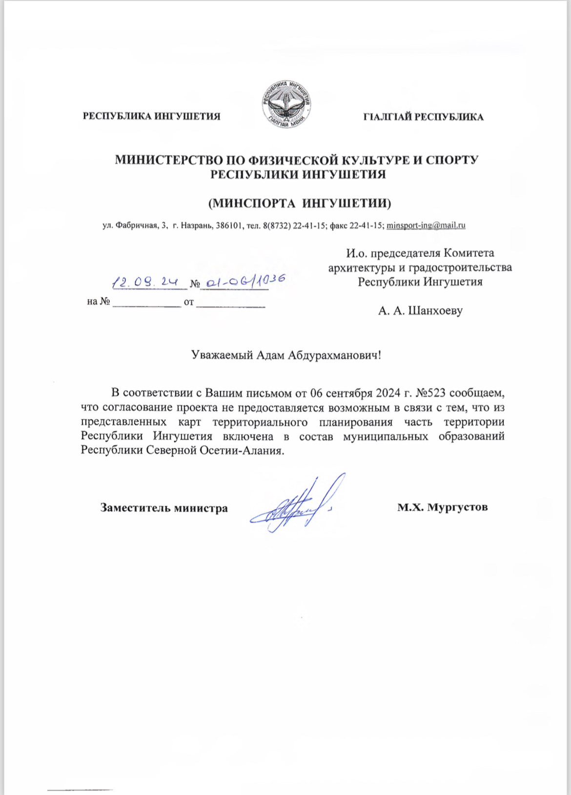 Министерство труда, занятости и социального развития Республики Ингушетия также выразило свои возражения. В своем письме от 12 сентября 2024 года министерство указало на недопустимость включения в проект территорий, находящихся под юрисдикцией Ингушетии. Представленные материалы не учитывают сложившиеся границы между республиками и представляют серьезную угрозу для территориальной целостности Ингушетии, говорится в документе.
