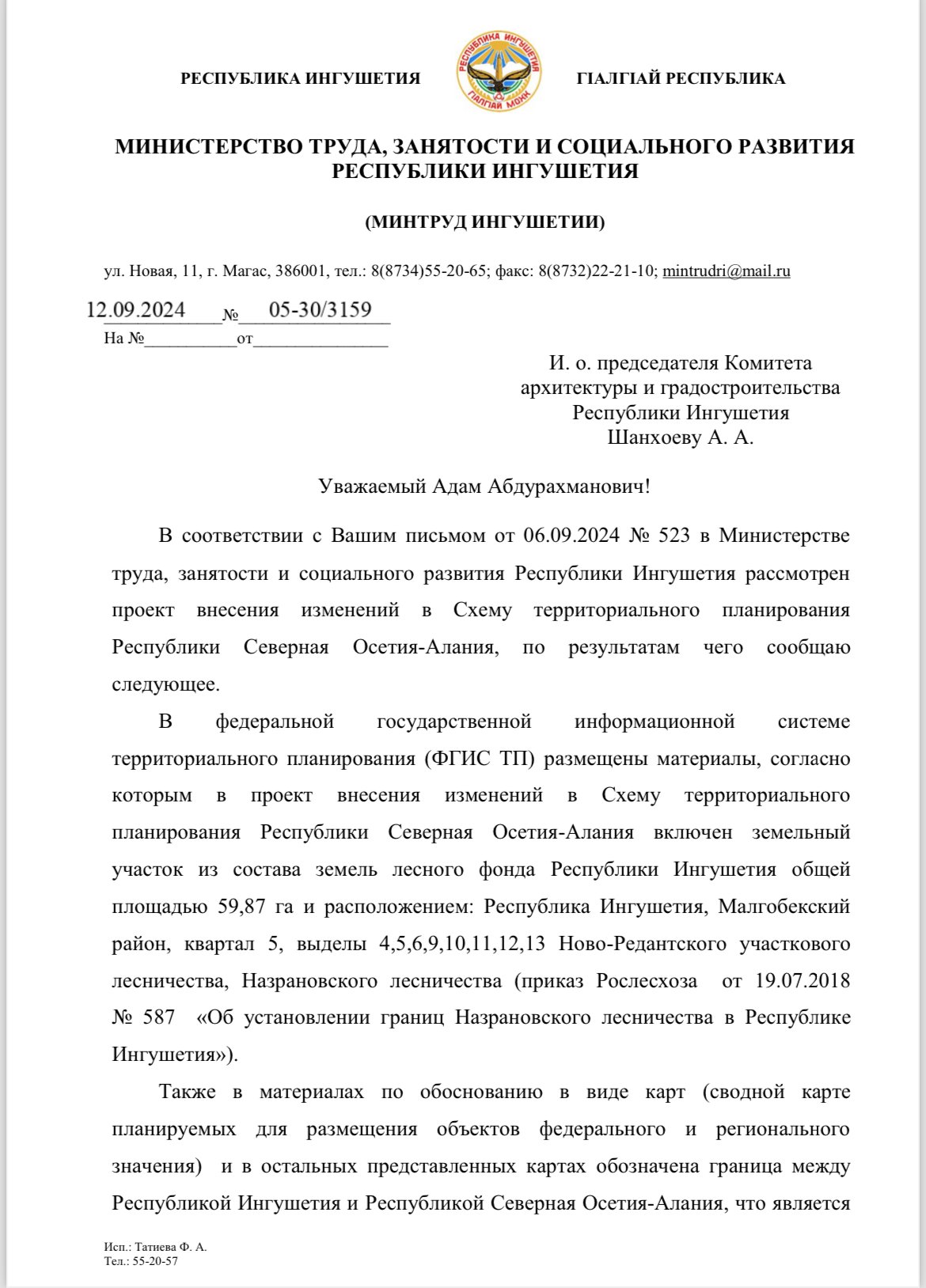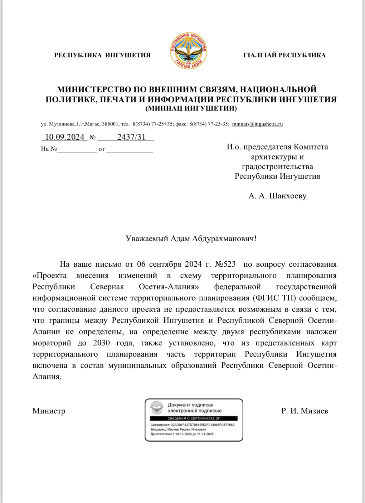 Между Ингушетией и Северной Осетией до сих пор не определены официальные границы, подчеркнуло Министерство по внешним связям, национальной политике, печати и информации Республики Ингушетия в письме от 10 сентября 2024 года.
