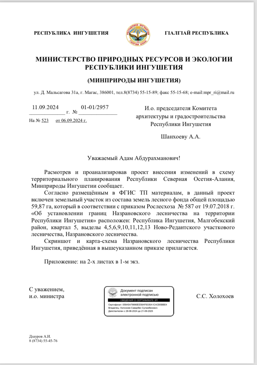Министерство природных ресурсов и экологии Республики Ингушетия в своем заключении от 11 сентября 2024 года отмечает, что проект нарушает установленные границы Назрановского лесничества. Согласно приказу Рослесхоза № 587 от 2018 года, участок лесного фонда площадью 59,87 га закреплен за Ингушетией. Попытки включить этот участок в территорию Северной Осетии не только незаконны, но и противоречат федеральному законодательству, говорится в письме.