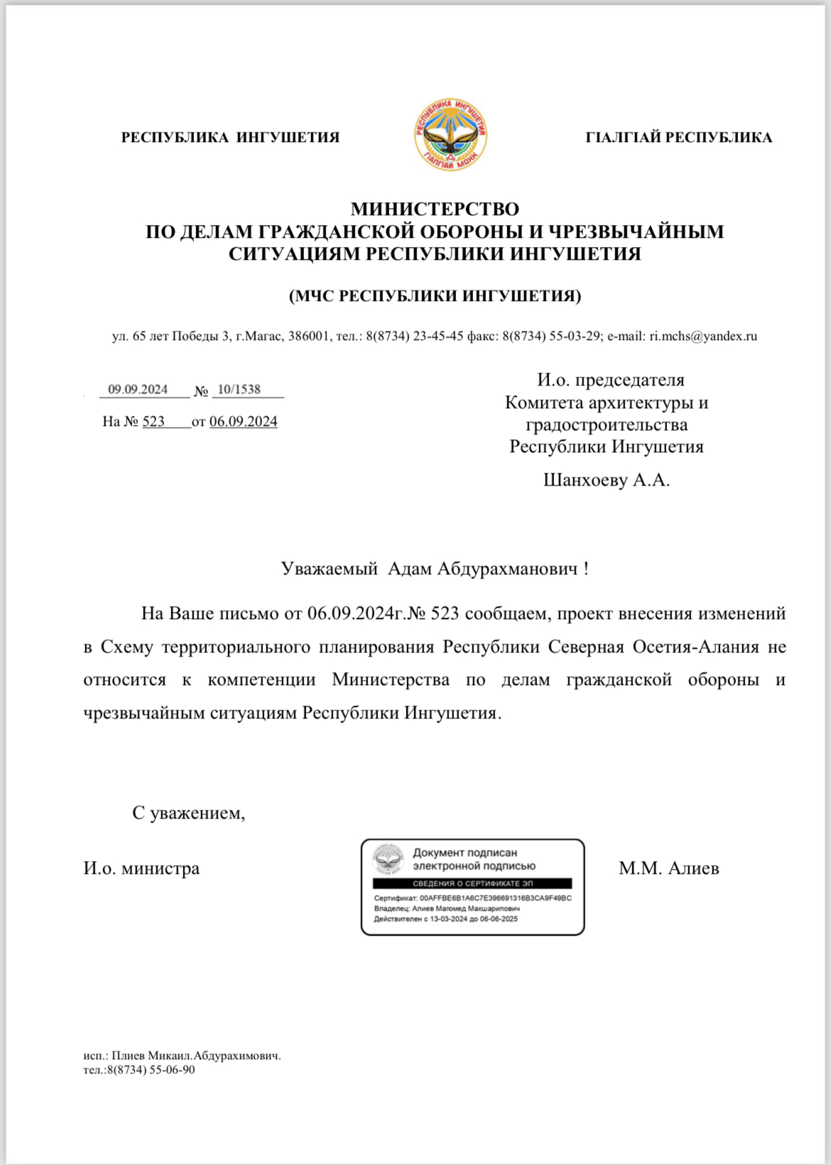 Министерство по делам гражданской обороны и чрезвычайным ситуациям Республики Ингушетия, хотя и не участвует непосредственно в обсуждении проекта, отметило, что данный вопрос не входит в их компетенцию, передав решение соответствующим органам.